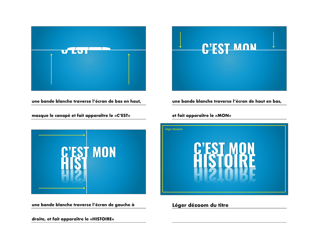 For the religious television channel EMCITV, I had the opportunity to work on the opening and closing credits for the show "C'est Mon Histoire." After understanding the subject matter, I proceeded to create a detailed storyboard.