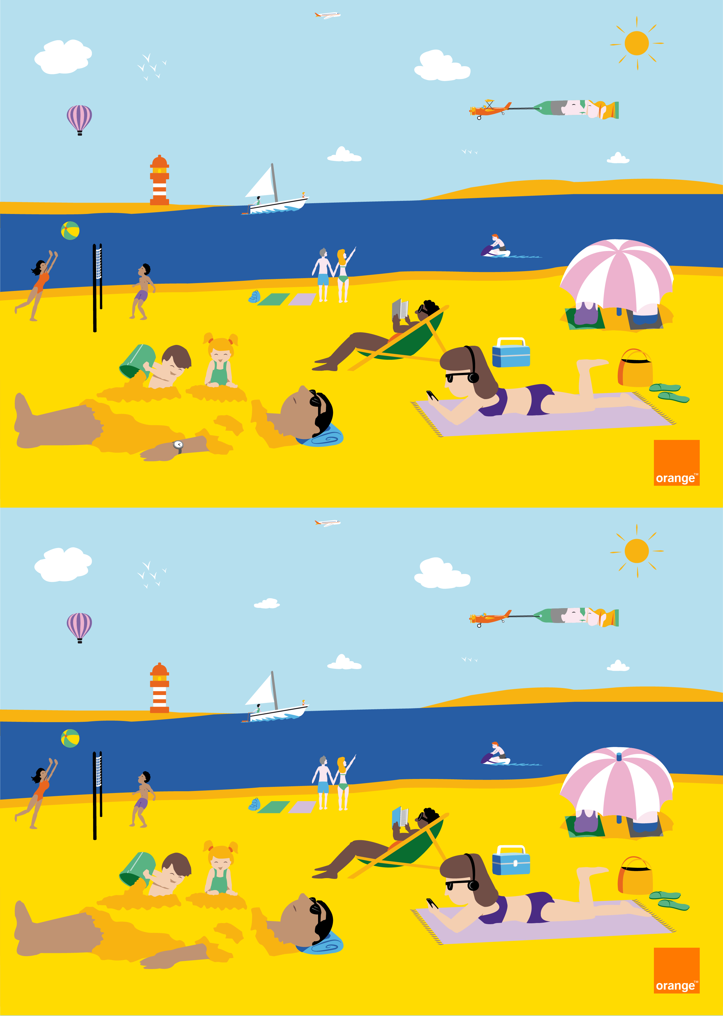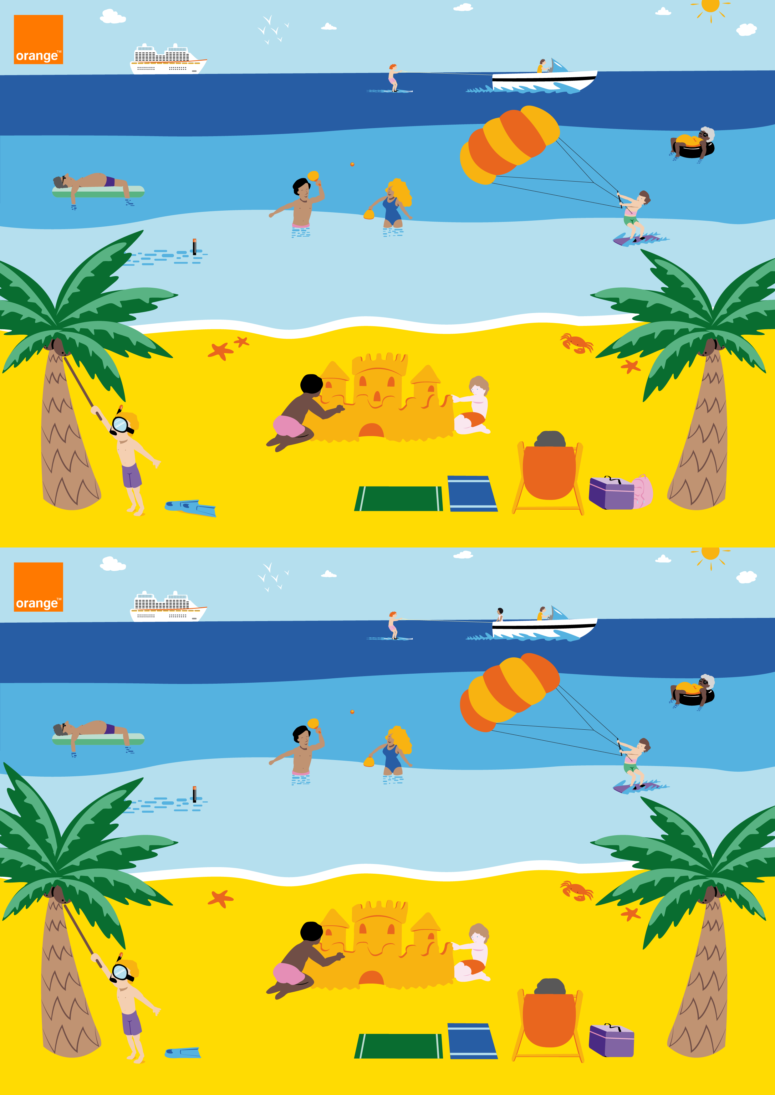 Initially, this project was a request for illustrations for a "spot the difference" game contest organized by the French group Orange. The illustrations had to adhere to the company's color scheme.